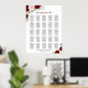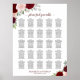 This beautiful 25 table wedding seating chart features a rustic hand painted watercolor design with crimson red, burgundy, and blush pink roses, along with sprigs of eucalyptus leaves and garden greenery. The traditional layout has space for 250 guests with 10 seats per table. The elegant script calligraphy title reads "please find your table" and there is space for the names of the couple and wedding date at the bottom. Wonderful way to add elegance and style to your wedding reception while making it easy for your guests to find their tables.