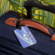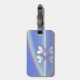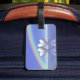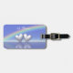 Luggage tag with my blue image of two silver hearts floating on the water under a rainbow.