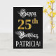 The front of this lavish and luxurious birthday greeting card design features the message “Happy 25th Birthday,”, and a personalized recipient name. Some of the message is in a fancy script-style text. The large number “25th” features a faux/imitation gold-inspired look pattern. The background is coloured black. The inside has a customizable birthday greeting message, or could perhaps be cleared and left blank if a message is to be written by hand instead. An ornate, customizable birthday greeting card like this might be used to acknowledge somebody’s twenty-fifth birthday. [~Z0000559]