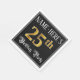This ornate and fancy birthday paper napkin design features a customizable name and the message “25th Birthday Party”. The large number “25th” has an imitation/faux gold-inspired coloring pattern, and the words “Birthday Party” are in opulent script-style text. The background is colored black by default (although it can be customized). Opulent, luxurious paper napkins like this might be used at a birthday celebration being held in celebration of somebody’s twenty fifth birthday. [~Z0000565]