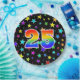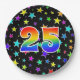 This cheerful, fun, and colourful paper plate design features a large number "25" containing a rainbow spectrum gradient inspired pattern. The background features a colourful pattern of star shapes. Paper plates like this might be fun to use at a celebration being held to honour somebody who is celebrating their 25th birthday, or a couple’s twenty fifth anniversary, or some other 25th event. [~Z0000493]