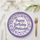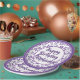 This numeric design has a purple and white random number pattern with a purple milestone number 25 repeated in varied sizes and angles. There is a white circle in the centre for your text and purple-and-white rings around the rim.