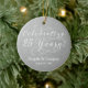 Silver 25th wedding anniversary personalized ornament. Silver and white with the wording celebrating 25 years in a script font with flourishes. Personalized with your names and wedding date. Ink is silver coloured, but not metallic.