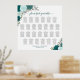 This beautiful 26-table wedding seating chart combines rustic charm and elegant style. Features a rustic boho chic floral design adorned with lovely hand-painted watercolor roses and flowers in shades of teal, turquoise, aqua, and cyan. Sprinkled throughout are delightful sprigs of eucalyptus and garden greenery, accompanied by a sophisticated calligraphy title. With seating arrangements for 260 guests, and 10 seats per table, this seating chart will make it easy for guests to find their designated table.