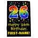 This fun, colourful, and vibrant birthday themed gift bag design features a large number "26" with a rainbow spectrum gradient style pattern, along with the message "Happy 26th Birthday,", and a customizable recipient name. It also has a colourful background pattern featuring star shapes of various sizes. A gift bag like this might be used when giving a gift or present in honour of somebody’s 26th birthday. [~Z0000510]