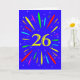 An explosive 26th birthday card! What a wonderful way to send birthday greetings. The number 26 in bright yellow with an explosion of bright colours and stars.