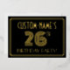 The front of this 1920s-1930s style inspired twenty-sixth birthday celebration/party foil invitation features a customizable name, a large art deco style inspired number “26TH”, the message “BIRTHDAY PARTY!”, and a border pattern consisting of lines. The front also has a black-coloured background by default, but it can be customized to a different colour if desired. The back features personalized details about the event, such as the date, time, location, and any other relevant information. Elegant, luxurious, personalized invitations like these might be used to invite guests to a birthday celebration being held in celebration of somebody’s 26th birthday. [~Z0000590]