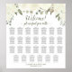 This beautiful wedding seating chart features a rustic boho chic floral design with hand painted watercolor roses, blossoms, and flowers in shades of ivory, white, and cream, along with sage green eucalyptus leaves and garden foliage. The title reads "Welcome! please find your table" in elegant script calligraphy. The seating chart has space for 270 guests at 27 tables with 10 seats per table. There is room for the names of the couple and wedding date at the bottom. Wonderful way to welcome your guests to your reception while making it easy for them to find their seats.