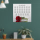 This beautiful 27 table wedding seating chart features a photo of a single long stemmed red rose lying on its side reflecting in water with waves and ripples. The title reads "please find your table" in elegant lacy script calligraphy. There is space for the couples' names and wedding date. This chart has table assignments for 270 guests at the traditional seating arrangement of 10 people per table.