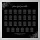 This beautiful wedding seating chart has seating assignments for 27 tables at 10 seats per table or 270 guests. It features a simple yet elegant design with light gray text on a black background and lacy decorative faux foil silver filigree in the corners. The title is written in fancy script calligraphy and reads: Please find your table. Stylish and sophisticated!