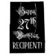 This fancy and opulent birthday gift bag design features the message “Happy 27th Birthday,” in ornate script style text, on a black coloured background. It also features a customizable recipient name. A gift-bag like this might be used when wrapping gifts being given to somebody in celebration of their 27th birthday. [~Z0000557]