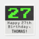 This fun and geeky birthday-themed paper napkin design features a large green classic computer game style number "27" on a black coloured background. It also features the birthday greeting message "Happy 27th Birthday,", and a custom name. Silly paper napkins like this might be used at a party being held to celebrate the twenty seventh birthday of a computing historian, an engineer, or somebody who enjoys vintage computer games. [~Z0000404]