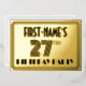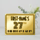 The front of this luxurious and Roaring Twenties inspired twenty-seventh birthday celebration foil invitation card design features a personalized name, an intricate art deco style inspired number “27th”, the message “BIRTHDAY PARTY”, and a border pattern consisting of lines. The back features personalized details about the event, such as the date, time, venue/place, and any other information that may be important. Elegant, stylish, customizable invitations like these might be used to invite guests/attendees to a birthday gathering being held to celebrate somebody’s 27th birthday. [~Z0000594]