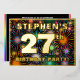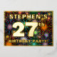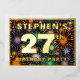 The front of this upbeat twenty-seventh birthday party/celebration foil invitation card design features an editable name, a large number “27th”, the message “BIRTHDAY PARTY!”, and a border. The background of the front has an exciting, colourful bursting celebratory fireworks-inspired pattern. The back features personalized details about the event, such as the date, time, location, and any other useful information. Customizable invitations like these might be a fun way to invite attendees to a birthday party being held in celebration of somebody’s 27th birthday. [~Z0000602]