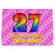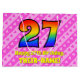 This festive and happy 27th birthday-themed gift bag design features a large number "27" having a rainbow spectrum inspired gradient pattern. It also features the message "Happy 27th Birthday,", and a personalized name. The background features a pattern of dark pink and light pink stripes containing loving pink heart shapes. A gift bag like this might be used when wrapping presents or gifts being given to celebrate somebody’s twenty seventh birthday. [~Z0000414]