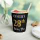 This elegant and ornate birthday themed paper cup design features a custom name and the message “28th Birthday Party”. The large number “28th” has a faux/imitation gold-inspired coloring pattern, the words “Birthday Party” are in fancy script-style text, and the background is colored black by default (although it can be customized). Luxurious, opulent paper cups like this might be useful to have at a birthday party being held in celebration of somebody’s 28th birthday. [~Z0000567]