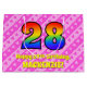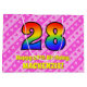 This happy and festive 28th birthday-themed gift bag design features a large number "28" having a pattern inspired by the look of a rainbow spectrum. It also features the message "Happy 28th Birthday,", followed by a personalized name. The background features a cheerful pattern of dark pink and light pink stripes containing loving pink heart shapes. A gift bag like this might be used when wrapping presents or gifts being given in honour of somebody’s twenty eighth birthday. [~Z0000414]