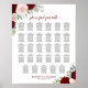 This beautiful 29 table wedding seating chart has seating assignments for 290 guests with 10 seats per table. The rustic boho chic design features hand painted watercolor roses in shades of burgundy, red and blush pink, with a bounty of eucalyptus leaves, foliage, and garden greenery. The lacy script calligraphy title reads "please find your table" and there is space for the names of the couple and wedding date below. Lovely way to add elegance and style to your wedding reception while making it easy for your guests to find their tables.