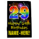 This fun, colourful, and exciting birthday-themed gift bag design features a large number "29" with a rainbow spectrum gradient style pattern, along with the message "Happy 29th Birthday,", and a customizable recipient name. It also features a colourful background pattern inspired by the look of bursting celebratory fireworks. A birthday themed gift-bag like this might be a fun way to wrap a gift or present being given to somebody who is celebrating their 29th birthday. [~Z0000509]