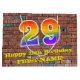 This colourful and vibrant birthday gift bag design, inspired by graffiti, features a large number "29" having a rainbow spectrum gradient inspired pattern. It also features the message "Happy 29th Birthday,", and an editable name. It also has a brick wall style pattern background. A fun gift bag like this might be used when giving a gift or present in honour of somebody’s twenty ninth birthday. [~Z0000522]