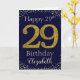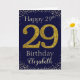 Happy Birthday with simulated golden glitter number 29 set on a solid colour and framed by faux diamonds and rhinestones. Happy birthday and recipients name in off-white font. Personalize with name or message.