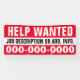 Are you hiring and want to get the word out? This 2.5' x 6' single sided, "Help Wanted" banner with job description line and phone number, is fully customizable! For indoor or outdoor use. All banners are hemmed and welded for a clean finished edge. For easy outdoor installation, on any surface, use the grommet option.