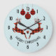 A clock which says "Merry Christmas" in curved text. Designed with an illustration of 2 Christmas deer jumping. Deer are made of red and black lumberjack plaid, with a little heart in between them. Red and black plaid Christmas decorations hang down from the top.
