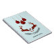 A personalized notebook which says "Merry Christmas" in curved text. Designed with an illustration of 2 Christmas deer jumping. Deer are made of red and black lumberjack plaid, with a little heart in between them. Red and black plaid Christmas decorations hang down from the top. Light blue background.