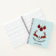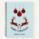 A personalized spiral notebook which says "Merry Christmas" in curved text. Designed with an illustration of 2 Christmas deer jumping. Deer are made of red and black lumberjack plaid, with a little heart in between them. Red and black plaid Christmas decorations hang down from the top.