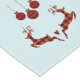 A table runner designed with an illustration of 2 Christmas deer jumping. Deer are made of red and black lumberjack plaid, with a little heart in between them. Red and black plaid Christmas decorations hang down from the top. Light blue background.