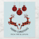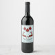 A personalized wine bottle label which says "Merry Christmas" in curved text. Designed with an illustration of 2 Christmas deer jumping. Deer are made of red and black lumberjack plaid, with a little heart in between them. Red and black plaid Christmas decorations hang down from the top.