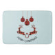 A bath mat which say "Merry Christmas" in curved text. Designed with an illustration of 2 Christmas deer jumping. Deer are made of red and black lumberjack plaid, with a little heart in between them. Red and black plaid Christmas decorations hang down from the top. Light blue background.
