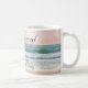 Inspirational quote scripture coffee mug depicts a girl walking on a beautiful ocean beach at sunset. It features Bible Verse 2 Corinthians 3:18, We are being transformed into His image from Glory to Glory.
