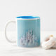 une tasse avec un dragon bleu et un château dessus.