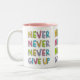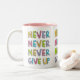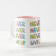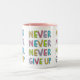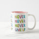 Tasse personnalisable avec le slogan de motivation pour la détermination et la confiance - imaginaires n'abandonnez jamais - en typographie colorée, style de bande dessinée.