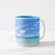 Une tasse avec intérieur bleu et une copie tropicale de mer, de sable/de plage, d'arbres et de palmier sur l'extérieur. Le texte lit : "Détendez et appréciez le meilleur de la vie."