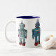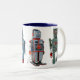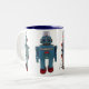 Quatre robots de bidon gardent cette tasse avec du charme.