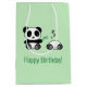 A pair of cute cartoon pandas. The left panda is holding a bamboo stick watching the right panda who has fallen asleep.