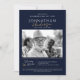 This elegant celebration of life invitation features a refined, modern layout with a navy blue background, classic serif fonts, and warm handwritten script accents. A black and white photo is beautifully framed on the front alongside personalized event details, while the back provides space for an additional photo to honour your loved one with a heartfelt visual tribute. The minimalist design and tasteful typography create a warm, respectful tone, making this invitation a timeless and dignified way to invite friends and family to a memorial or funeral service. Perfect for creating a lasting keepsake and honouring a life with grace. Available as printed cards or an instant digital download.