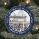 Celebrate the joy of your new place with a custom two photo "First Christmas in our New Home" navy blue and white round ceramic ornament. All text and pictures on this template are simple to personalize and can be different or the same on front and back. (IMAGE & TEXT DESIGN TIPS: 1) To adjust position of wording, add spaces at beginning or end. 2) To center the photo exactly how you want, crop it into a square shape before uploading to the Zazzle website.) Navy blue and white design features stylish modern minimalist typography name and year, and 2 images of your choice. This unique family keepsake adds an elegant touch to Xmas home decorations or makes a thoughtful housewarming realtor gift idea. There's no place like a new home for the holidays!