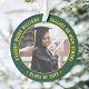 Commemorate the graduate's achievement with an elegant green and gold yellow custom two photo round graduation Christmas ornament. Pictures and all text are simple to customize and can be different on front and back. Include any favourite inspirational quote, motivational saying, school name and degree, congratulations, thanks mom and dad, or other message of your choice. Design features a green border, personalized modern typography name, school, & class year in a circle, and 2 photos of the graduate, such as senior pictures or images from the commencement ceremony. Makes a thoughtful keepsake graduation gift idea.