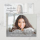 Announce the joyful news of an upcoming graduation party with chic modern 2 photo save the date postcard invitations. The wording on this template is simple to personalize with the graduate's name, class year and other announcement details. The colors, font styles and overlay opacity can be easily customized with the Zazzle design editor tool. The black and white design features a mortar board cap, elegant trendy script calligraphy, minimalist classic typography, and two photos of your choice, such as senior pictures or images from the commencement ceremony. These graduation save the date cards are a stylish way to share a special day celebration with family and friends. Congratulations to the graduate!
