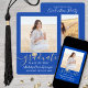 Invite family and friends to celebrate a high school or college graduation with stylish custom 2 photo royal blue, white and gold invitations. All pictures and wording are simple to personalize. (IMAGE PLACEMENT TIP: An easy way to centre a photo exactly how you want is to crop it before uploading to the Zazzle website.) Please note that the gold is printed colour, not metallic foil. The design features elegant script calligraphy with a mortar board cap, elegant modern typography, and two photos of your choice, such as senior pictures or images from the commencement ceremony. This elegant graduation invitation card is a trendy and chic way to begin your special day celebration. Congratulations to the graduate!
