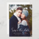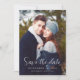 This simple, elegant photo Save the Date card features the words "Save the date" in modern handwriting script over your favourite vertical photo, along with your wedding date and location in serif font. A dark gradient screen helps make the white text pop. On the back, add a second photo, along with additional information and a QR code to guide guests to your wedding website.