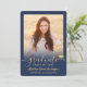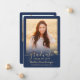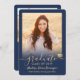 Share the joy of a high school or college graduation with these custom 2 photo navy blue and gold announcements. All pictures and wording are simple to personalize. (IMAGE PLACEMENT TIP: An easy way to centre a photo exactly how you want is to crop it before uploading to the Zazzle website.) This template is simple to customize with any details of your choice, such as party invitation info, parents' names, special honours, degree title, favourite inspirational quote, graduate's contact info, future education plans, or new job position. If there's any text not wanted simply delete it. Design features a faux gold foil mortar board cap, handwritten style script calligraphy, modern minimalist typography, and two photos of your choice, such as senior pictures or images from the commencement ceremony. These elegant graduation announcement cards are a trendy and chic way to share your special day celebration with family and friends. Congratulations to the graduate!
