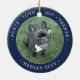 Celebrate the simple joys of your furry family member with this custom 2 photo round ceramic ornament. Text and dog pictures on this template are simple to personalize and can be different or the same on front and back. If preferred, change "Peace Love Joy Treats" to any quote or saying. The modern minimalist design features a navy blue and white border, stylish typography name and year, and 2 images of your choice. This unique dog lover keepsake adds an elegant touch to Xmas home decorations.