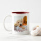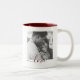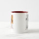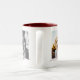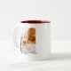 Fully customizable personalized double sided 2 photo template & maroon love text on two-tone mug.
