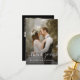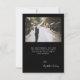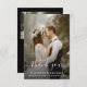 Modern wedding thank you card featuring a custom vertical photo on the front and a horizontal photo on the reverse. The words "Thank You" appear in white handwriting script with decorative swashes at the beginning and end. Add your names and the date and location of the wedding below in sans serif font. Personalize the reverse side with a message of your choice in white sans serif on a black background, and add your signature line in decorative handwriting font. Easily replace the sample images with your own wedding photos. A black gradient screen helps ensure the text on the front of the card pops.