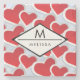 Stone marble coaster personalized with a name and initial designed with a repeating pattern of 2 different sized red hearts each heart surrounded by a white border. A diamond shaped frame layered over top with your text inside.