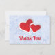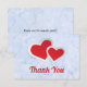 A thank you card with an illustration of 2 paper hearts - red with a white border. Set on a light blue marble background.